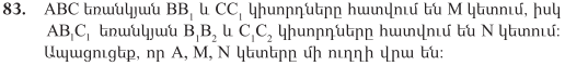 Քանի որ BB1 CC1 կիսորդները հատվում են M կետում և ըստ թիորեմի՝ եռանկյան կիսորդները հատվում են մի կետում ապա A,M,N կետերը գտնուվեմ են մի ուղու վրա AA1 հանդիսանւոմ է այկյան կիսորդ։