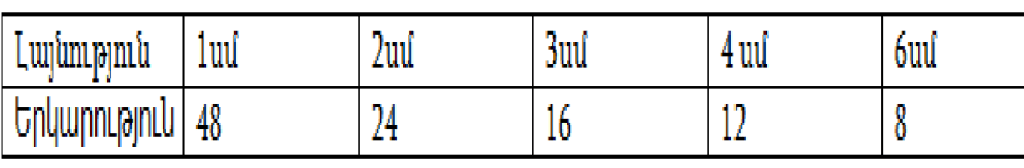 289․Ունենք միևնույն 48 սմ2 մակերեսով 5 ուղղանկյուն։ Այդ ուղղանկյուն ների լայնություններն են՝ 1 սմ, 2 սմ, 3 սմ, 4 սմ, 6 սմ։ Կազմե՛ք ուղղանկյուն նե րի լայնու թյու նից նրանց եր կարությունների կախման աղյուսակը և համա պատաս խան գրաֆիկը։