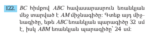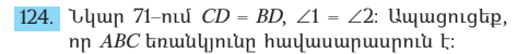 Քանի որ CD=BD AD ընդհանուր է <1=<2 ապա ըստ եռանկյունների հավասարության առաջին հայտանիշի 🔺ABC=🔺ADB ապա հետևում է որ 🔺ABC=հավասարասրուն է։