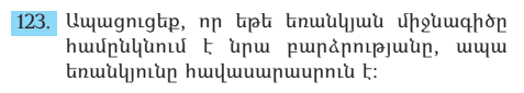 դ)Երկու հավասարումներ անվանում են համարժեք, եթե առաջինի ցանկա-ցած արմատ արմատ է նաև երկրորդի համար, իսկ երկրորդի ցանկացած ար-մատ հանդիսանում է առաջինի արմատ: