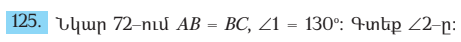 Քանի որ <1 և ❤ կից անկյուններ են ապա <3=180-130=50 քանի որ 🔺ABC հավասարասրուն եռանկյուն է ապա <3=<4=50 քանի որ <2 և <4 հակադիր են ապա <2=<4=500