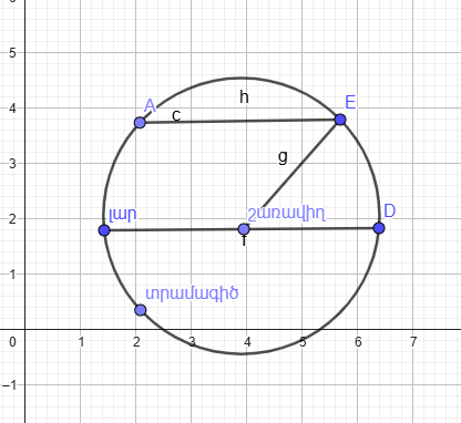 3․ GEOGEBRA ծրագրով գծել շրջանագիծ և տանել նրա շառավիղը, տրամագիծը և լարը: